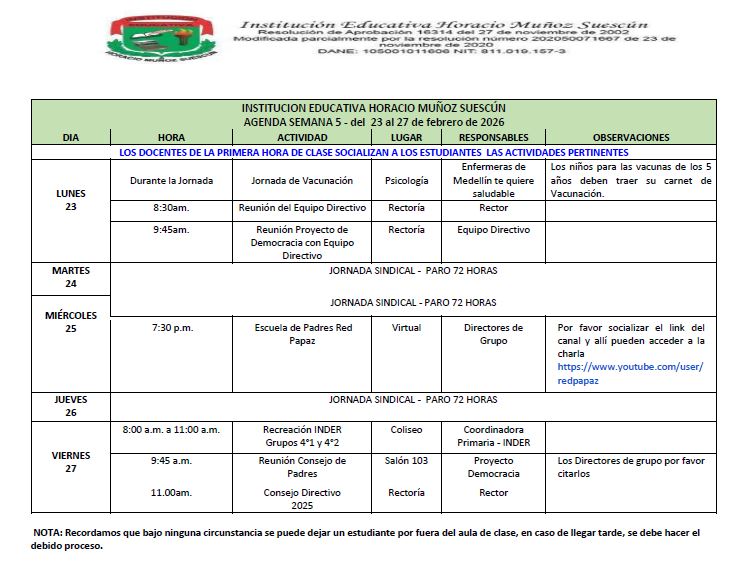 En la siguiente imagen se puede observar los principales aspectos de la agenda para la AGENDA SEMANA 5 - del 23 al 27 de febrero de 2026.