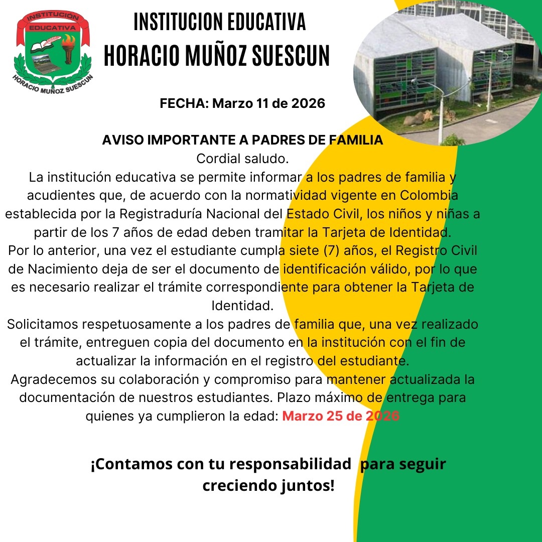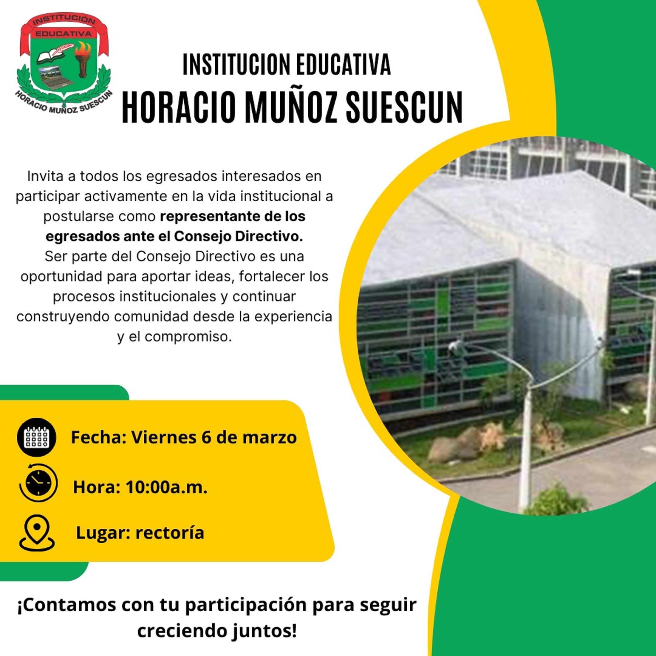 Queridos egresados de la Institución Educativa Institución Educativa Horacio Muñoz Suescún: Queremos extenderles una invitación muy especial. Nuestro colegio continúa creciendo, transformándose y soñando en grande y ustedes, como parte fundamental.