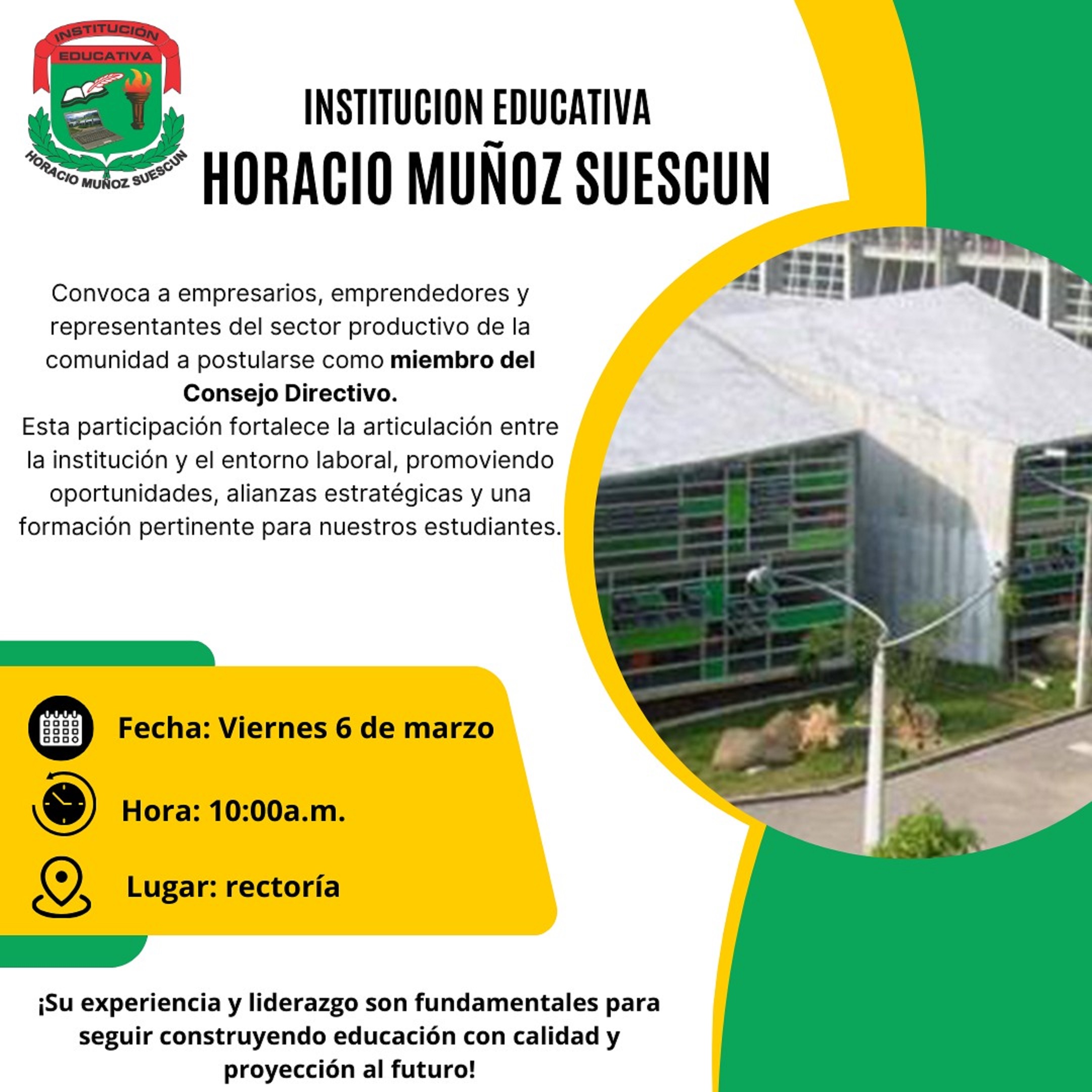 La I. E. Horacio Muñoz Suescún invita a la convocatoria para la postulación del Representante del Sector Productivo ante su Consejo Directivo.