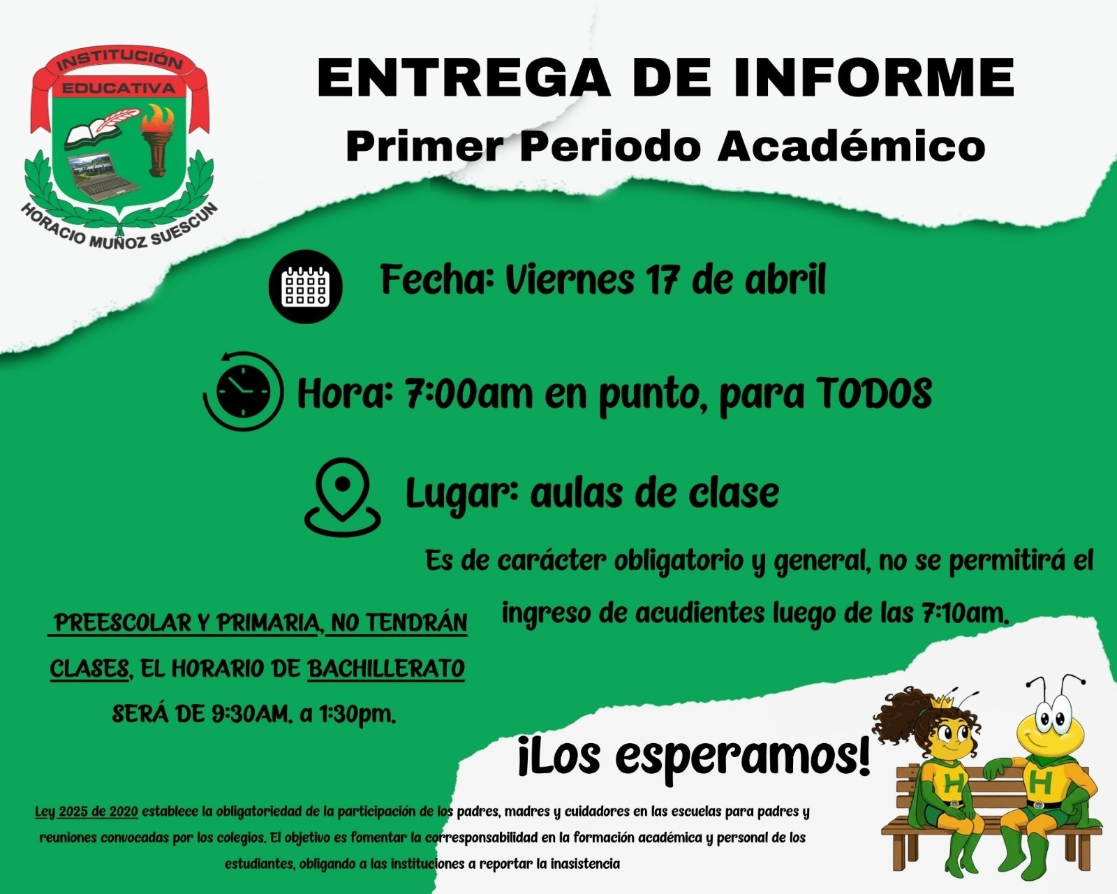 El próximo viernes 17 de abril se efectuara la entrega del informe obtenido por los estudiantes en el primer período académico de este año.