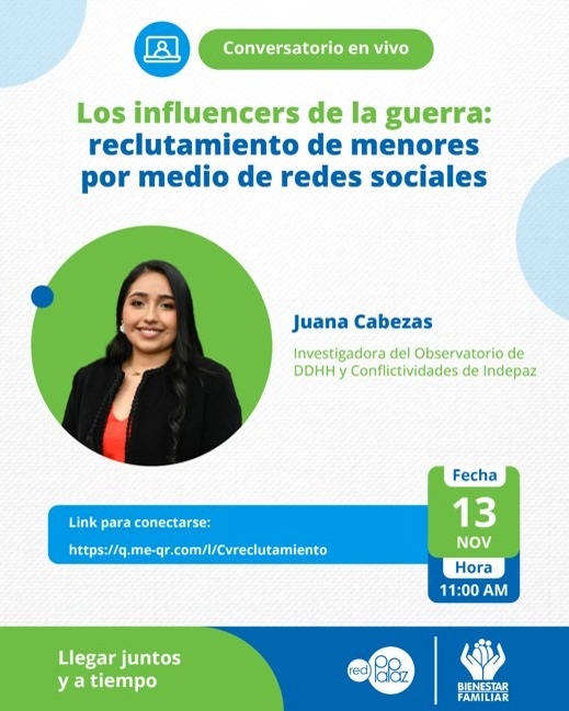 Los invitamos hoy 13 de noviembre al conversatorio virtual: Los influencers de la guerra: reclutamiento de menores por medio de redes sociales con Juana Cabezas a las 11:00am.